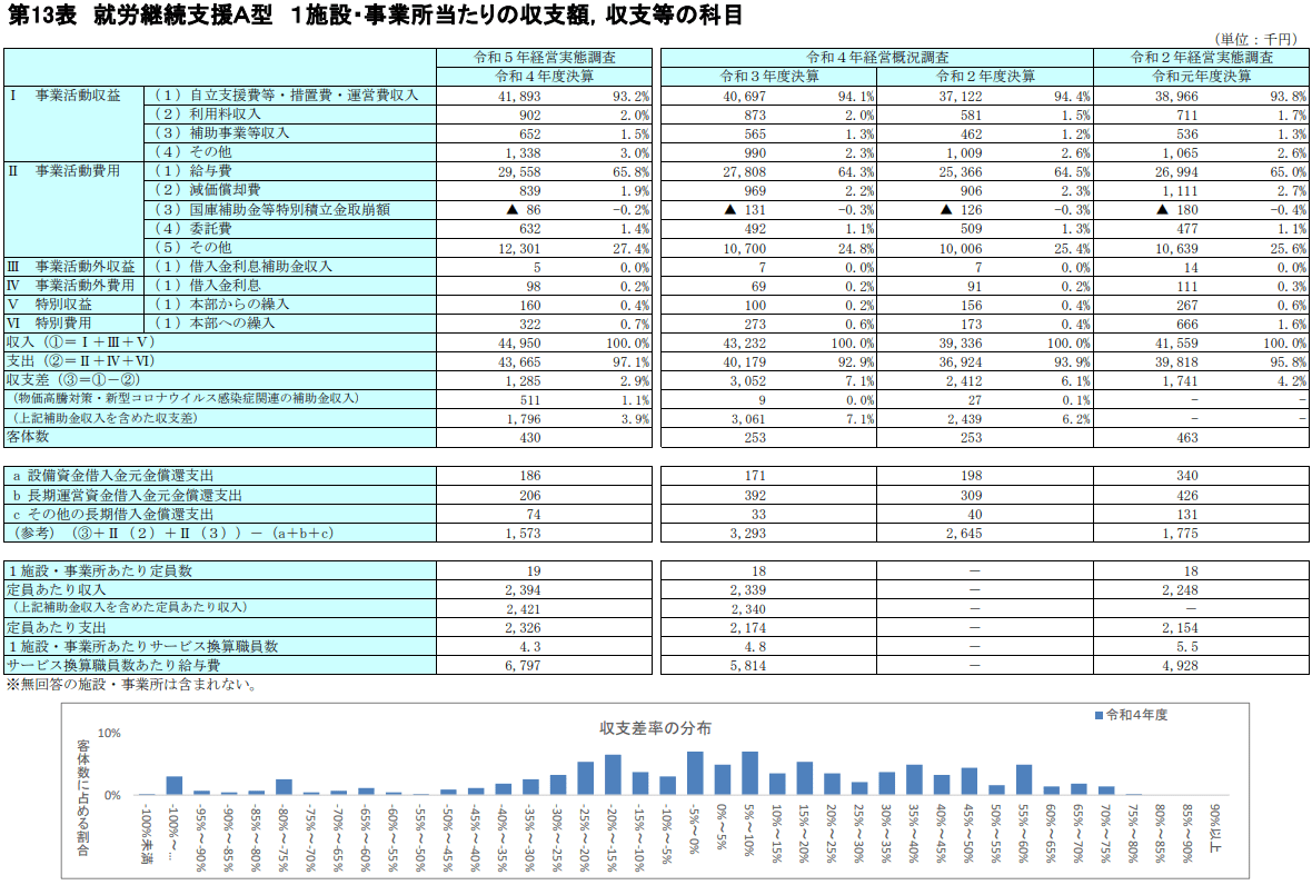 令和5年度の経営実態調査では、就労継続支援A型は年間売上が平均4,495万円、支出が平均4,366万円で全体的には黒字となっています。