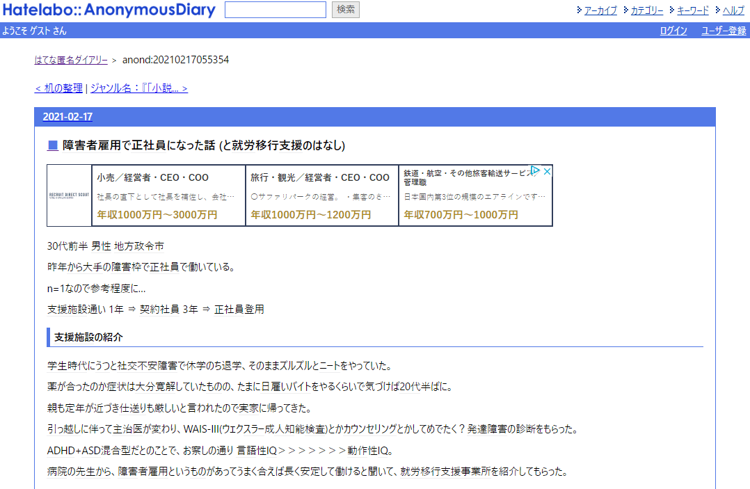 ニートの時期もあったようだけど、病院の先生から就労移行支援事業所を紹介してもらったとのこと。