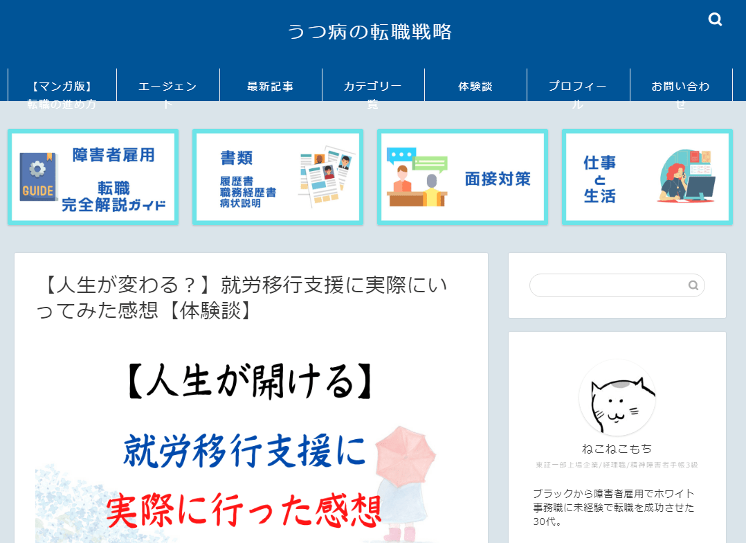 精神障害者手帳3級を持っており、現在は東証一部上場企業で事務職として働いている、ねこねこもちさんのブログ記事です。