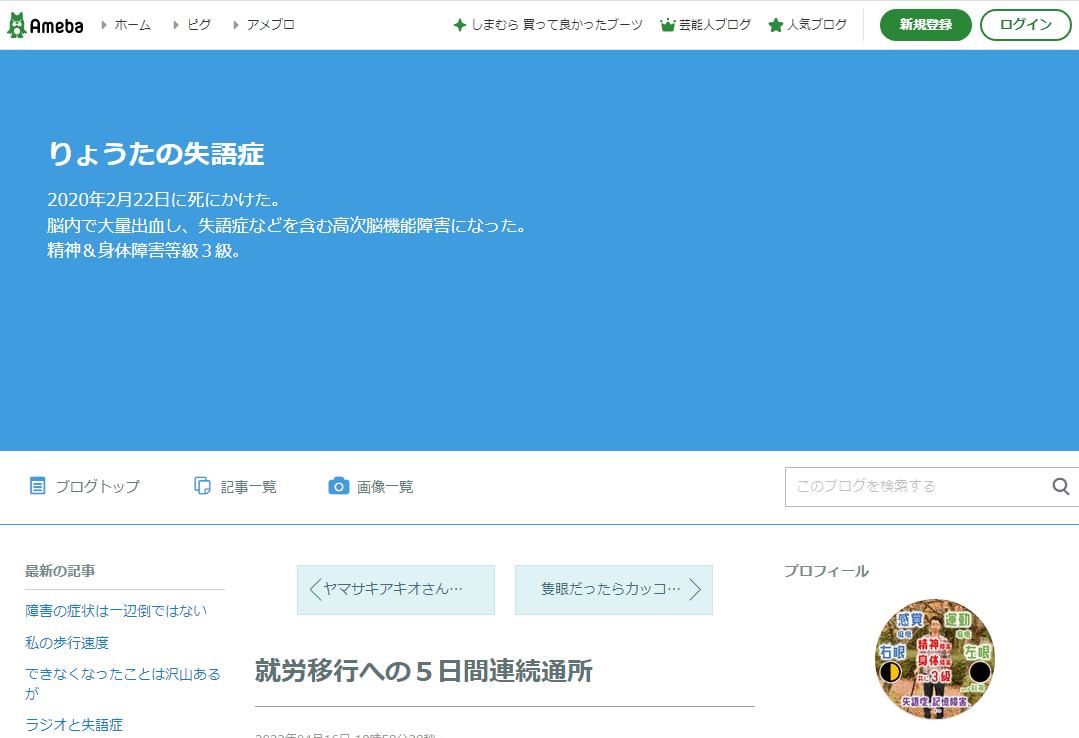 高次脳機能障害や運動麻痺などの症状を持つりょうたさんのブログ記事です。