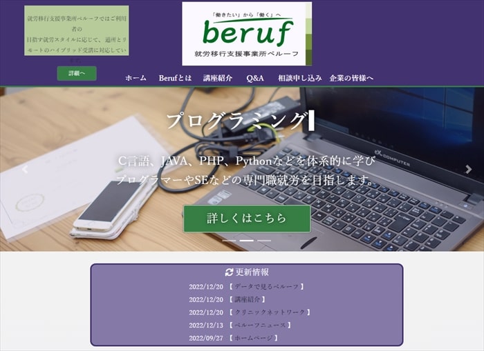 | 就職実績 | ▼就職例 Web制作会社でコーダー:通所13か月 完全在宅でのデータ入力・お客様対応:通所12か月 |