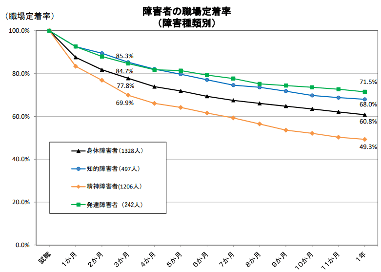 ↓他の障害と比べても精神障害者は、一番定着率が低いんだね‥。