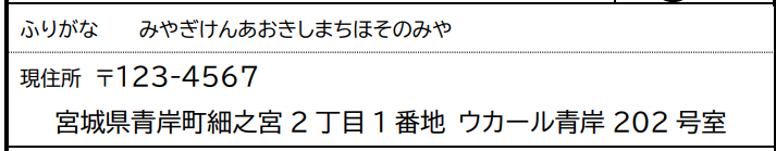 都道府県名から、マンション・アパート名まで書きます(部屋番号も)。