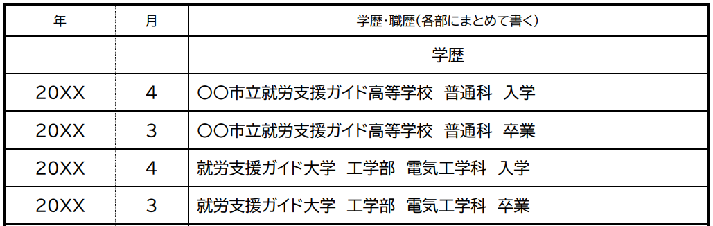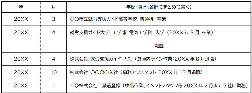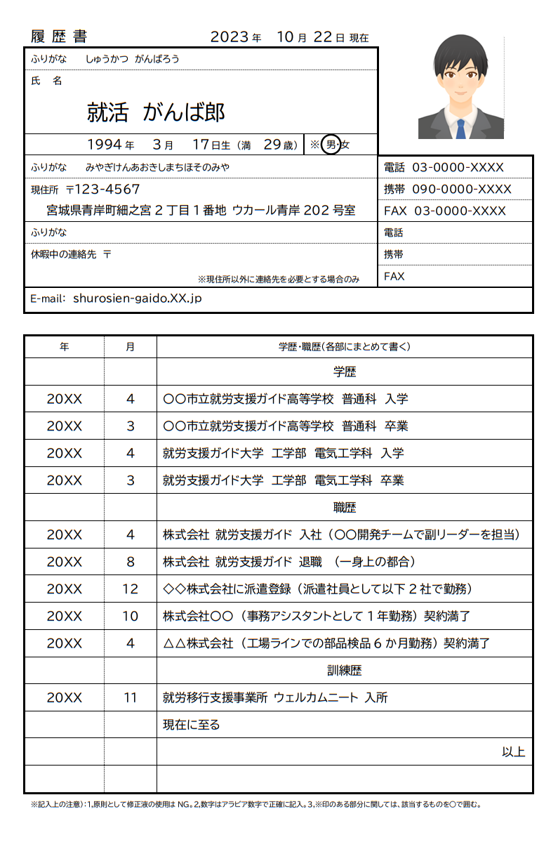 ↓「基本情報」「学歴・職歴・訓練歴」の見本