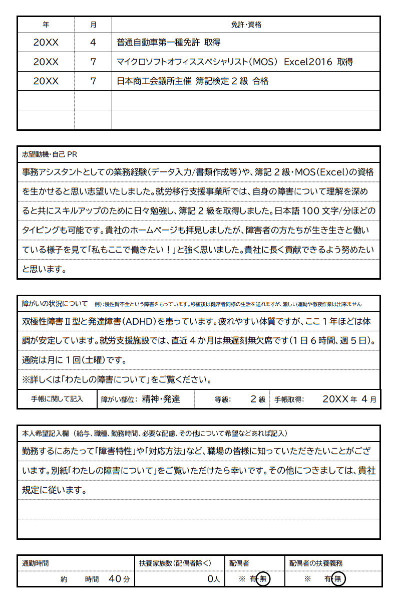 ↓「免許・資格」「志望動機・自己PR」「障害状況」「本人希望」「通勤時間・扶養」の見本