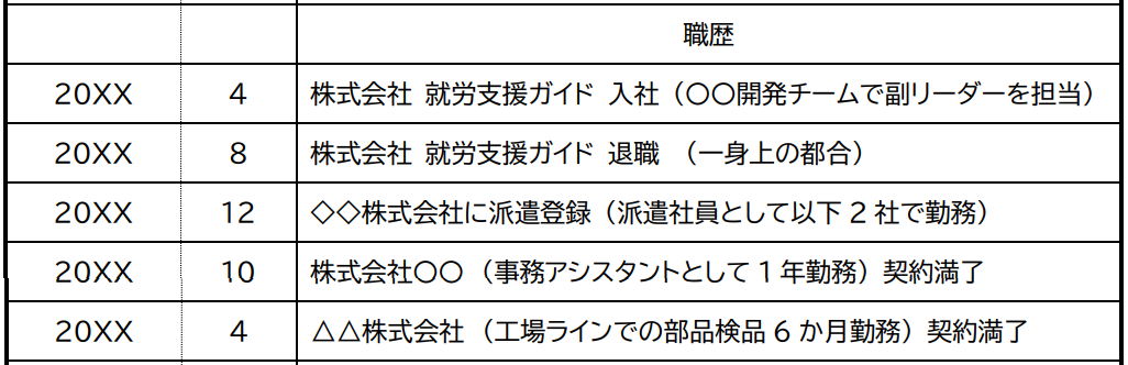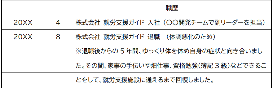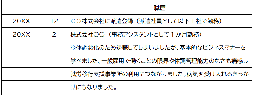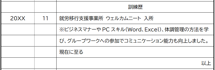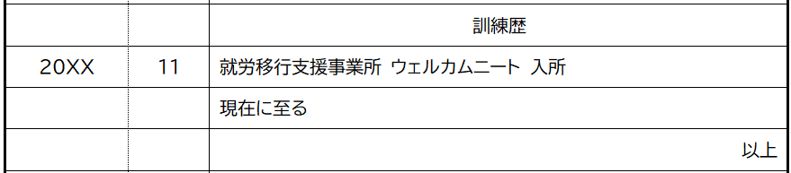 ちなみに、就労移行支援事業所や就労継続支援A型事業所(A型作業所)、就労継続支援B型事業所(B型作業所)の利用は「訓練歴」として履歴書の職歴欄に記載可能です。